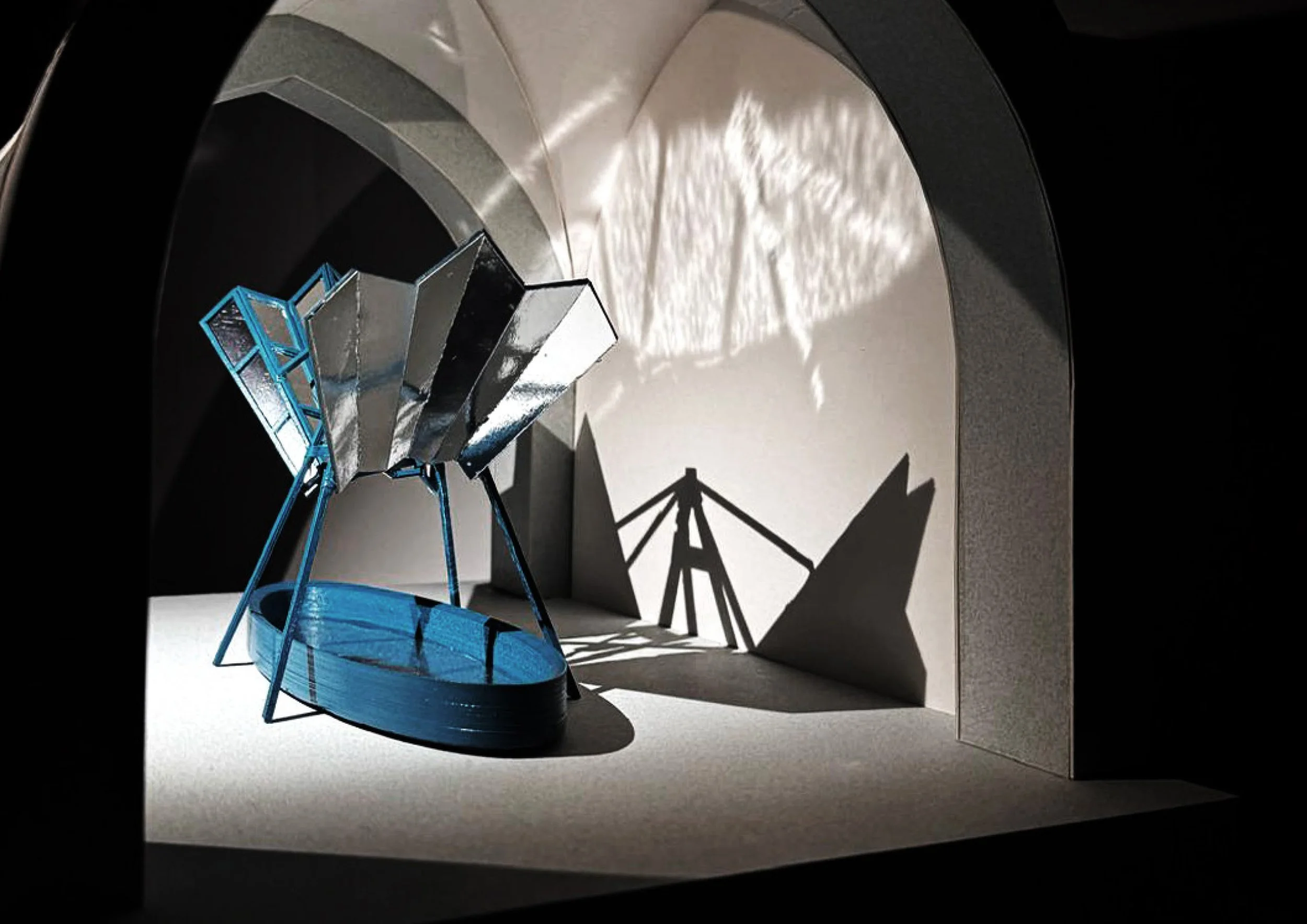 The installation works from both afar and up-close, offering new layers of experience as one approaches. At a distance, one first glimpses a glistening, facated wing, framed ergonomically by the gate’s archway. The facets are mirrored and reflect both the illuminated caustic water below and secondary reflections of the sculptural roof above. This structure is suspended delicately from its frame, rising like the shell of a freshwater clam which has opened to reveal its secrets within.